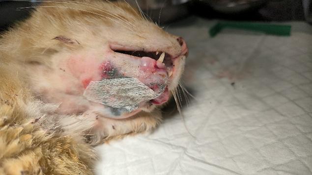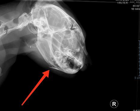 Durch das digitale Röntgengerät sieht man deutlich, dass nur ein Teil des Unterkieferknochens abgespalten ist. Die offene Verletzung wurde genäht und muss regelmäßig versorgt werden.